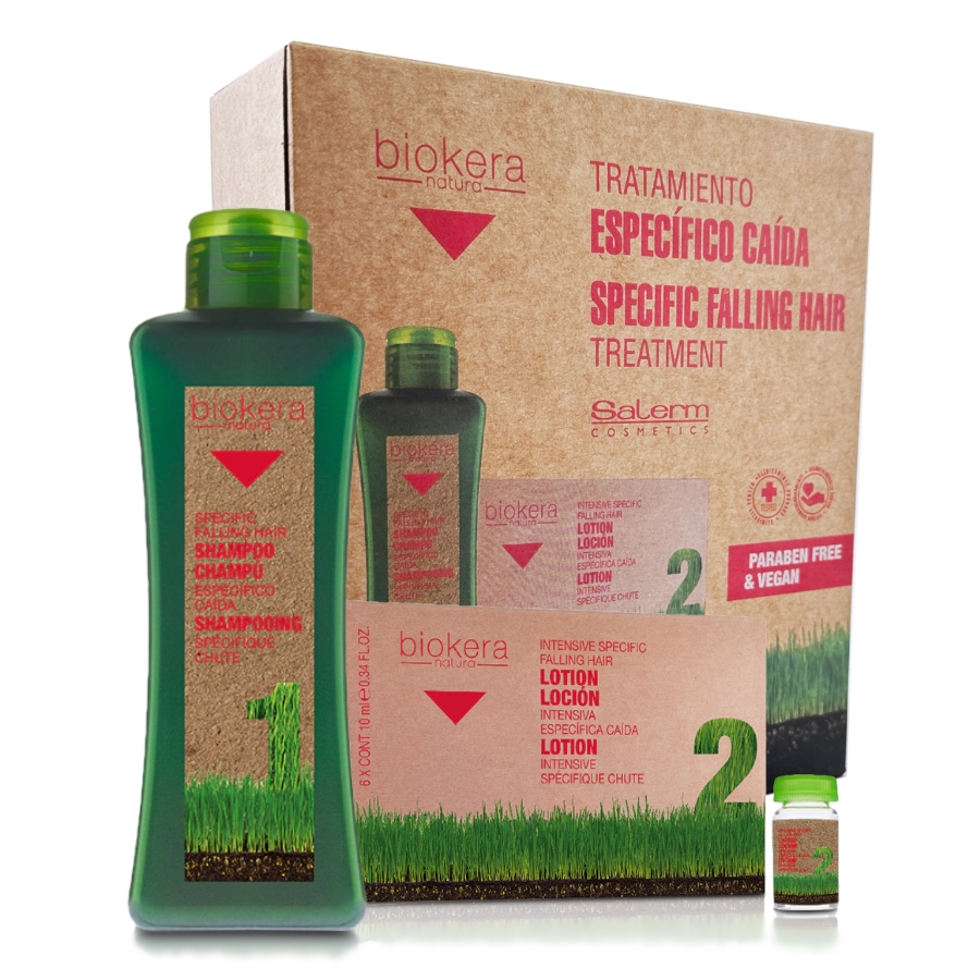 Kosmetická sada Salerm Biokera Specific Falling Hair je určena pro posílení slabých vlasů, zamezení vypadávání vlasů a podporu růstu nových a zdravých vlasů. Účinky jsou založeny na mixu bylinných extraktů, olejů, vitamínů a aminokyselin. Kompletní řada obsahuje extrakty z ženšenu, Ginkgo Biloby, lopuchu většího a sójový protein, biotin, kukuřičný olej, extrakt z kaštanů, olej z růže morušové, mentol, arginin, hydrolyzovaný keratin a aminokyseliny keratinu. Prvním krokem ošetření je aplikace šampónu Biokera Natura proti vypadávání vlasů. Šampón vlasovou pokožku důkladně připraví na vstřebání blahodárného mixu složek obsažených v ampulích a spreji. Zároveň vlasové cibulce dodá prvotní impulz k nastartování růstu a posílení vlasů. Intenzivní loción v ampulích se nanáší pomocí aplikátoru přímo na vlasovou pokožku. Následnou masáží se pak aktivuje přímo ve vlasovém lůnu (folikulu). Ampule vlasové cibulce přináší intenzivní šokovou terapii, která posiluje kotevní systém vlasů a podporuje mikrocirkulaci krve ve vlasové pokožce, což akceleruje bujení nových vlasů a zároveň prodlužuje růstovou (anagenní) fázi vlasů.