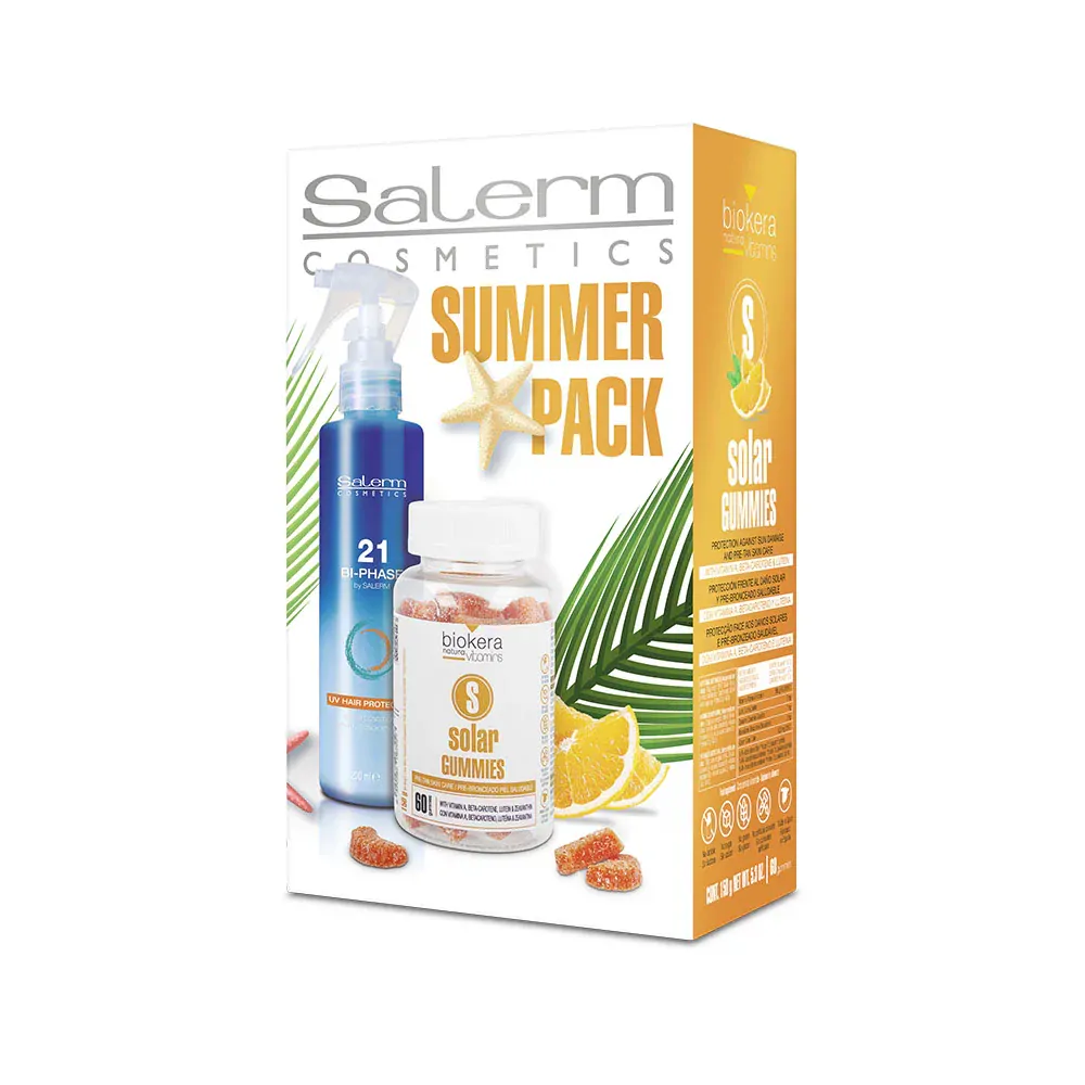 Exkluzivní letní kosmetická sada Salerm SUMMER PACK přináší komplexní péči o vlasy a pokožku během letních měsíců. Sada obsahuje dvoufázový bezoplachový kondicionér Salerm 21 Bi-Phase o objemu 190 ml, který usnadňuje rozčesávání, vyživuje vlasy, a zároveň chrání před škodlivými vlivy slunečního záření, chlóru a mořské vody díky odolným filtrům. Bezoplachový kondicionér je doplněn Salerm Biokera Gummies, gumovými vitamíny před opalováním o hmotnosti 150 g (60 bonbónů), které s příchutí pomeranče podporují zdravé opálení a chrání pokožku před oxidačním poškozením. Tato sada je ideální pro ty, kdo hledají komplexní řešení pro ochranu a výživu vlasů a pokožky v létě, s důrazem na přírodní složky, bez přidaného cukru a vhodné pro vegany.